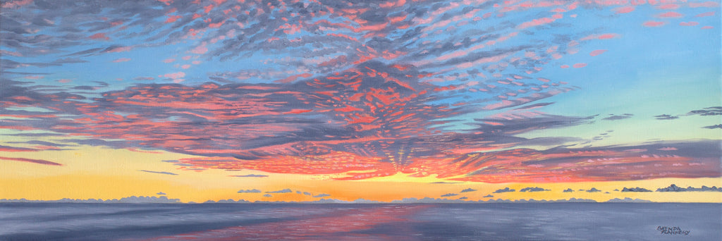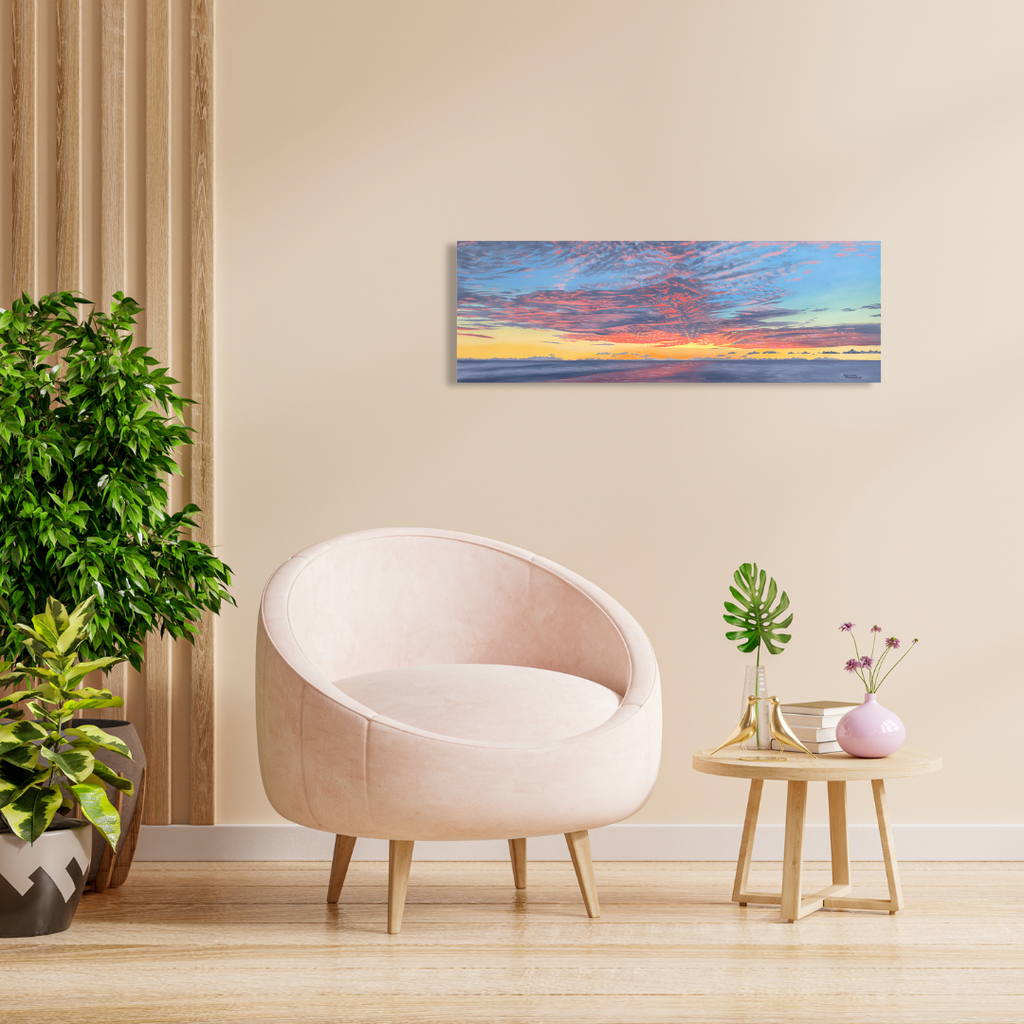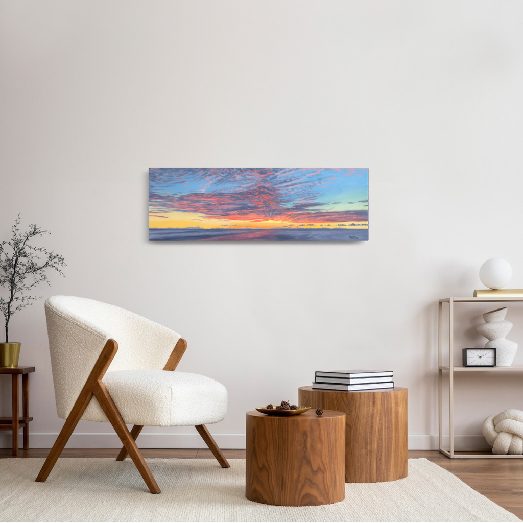 Blaze captures the fierce beauty of a sky set alight by the last light of day. Deep amber, burnt orange, and soft gold sweep across the horizon, reflecting over quiet water with a luminous warmth. This piece embodies the raw energy of nature’s transformation — that fleeting moment when light and motion dissolve into stillness.