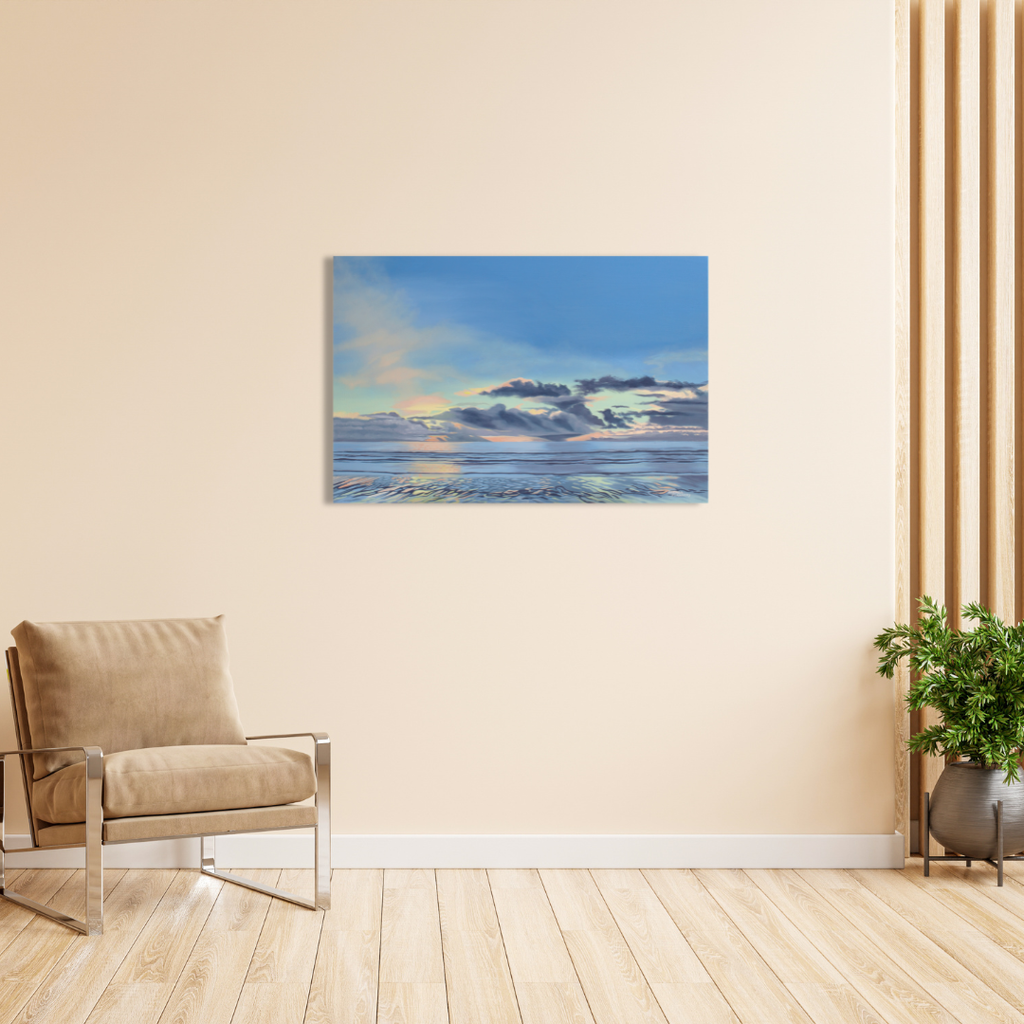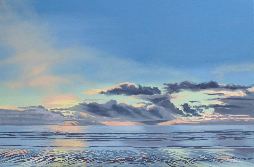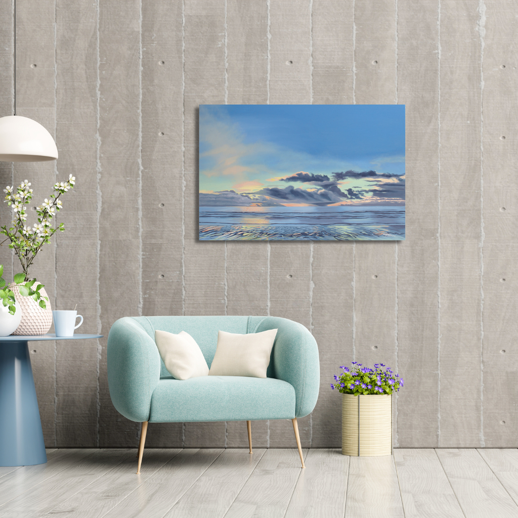 Solace captures that quiet, reflective moment when sea and sky merge into stillness at the close of day. Soft light drifts across the horizon, dissolving into gentle blues and muted golds that evoke calm and renewal. The surface of the water mirrors the shifting clouds above, inviting the viewer to pause, breathe, and rest in a state of peace. Painted with soft, blended layers to convey the gentle diffusion of light, this work explores the subtle beauty of transition — the space between movement and stillness.