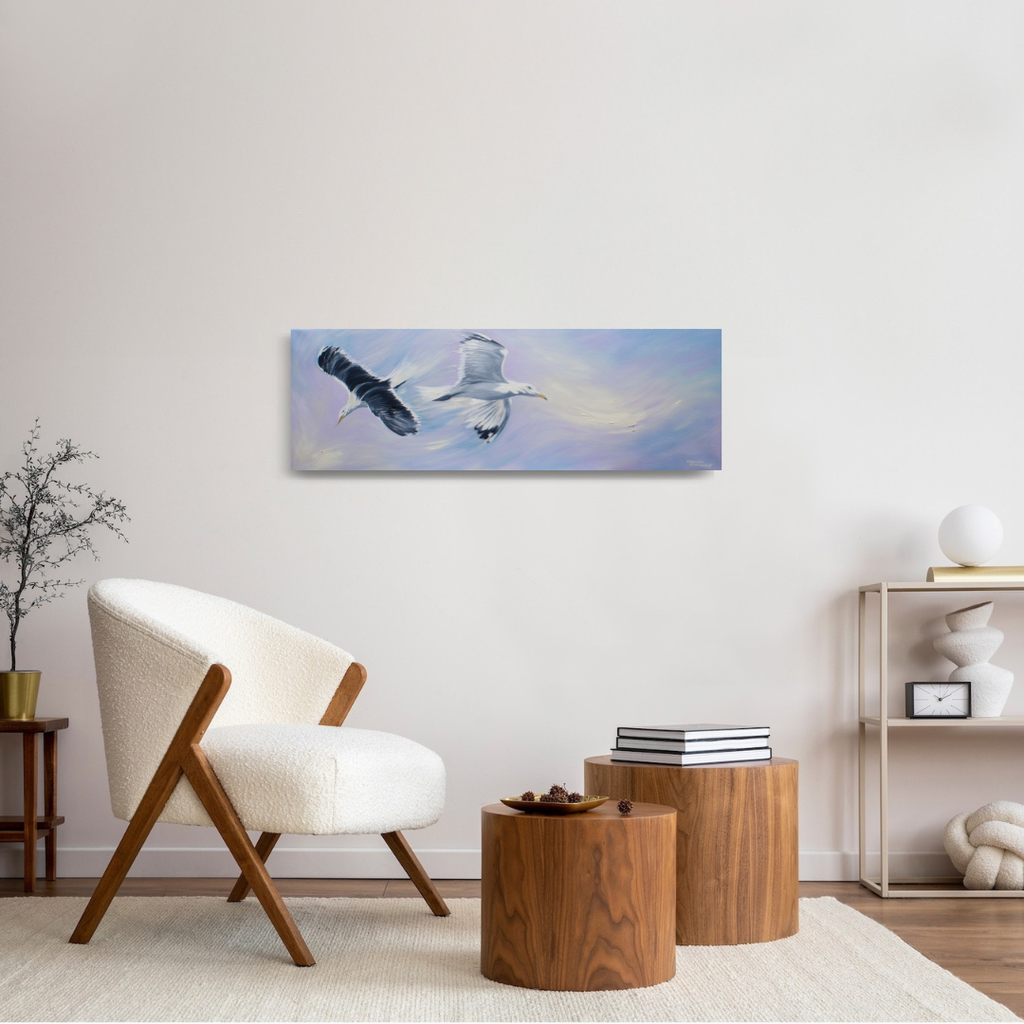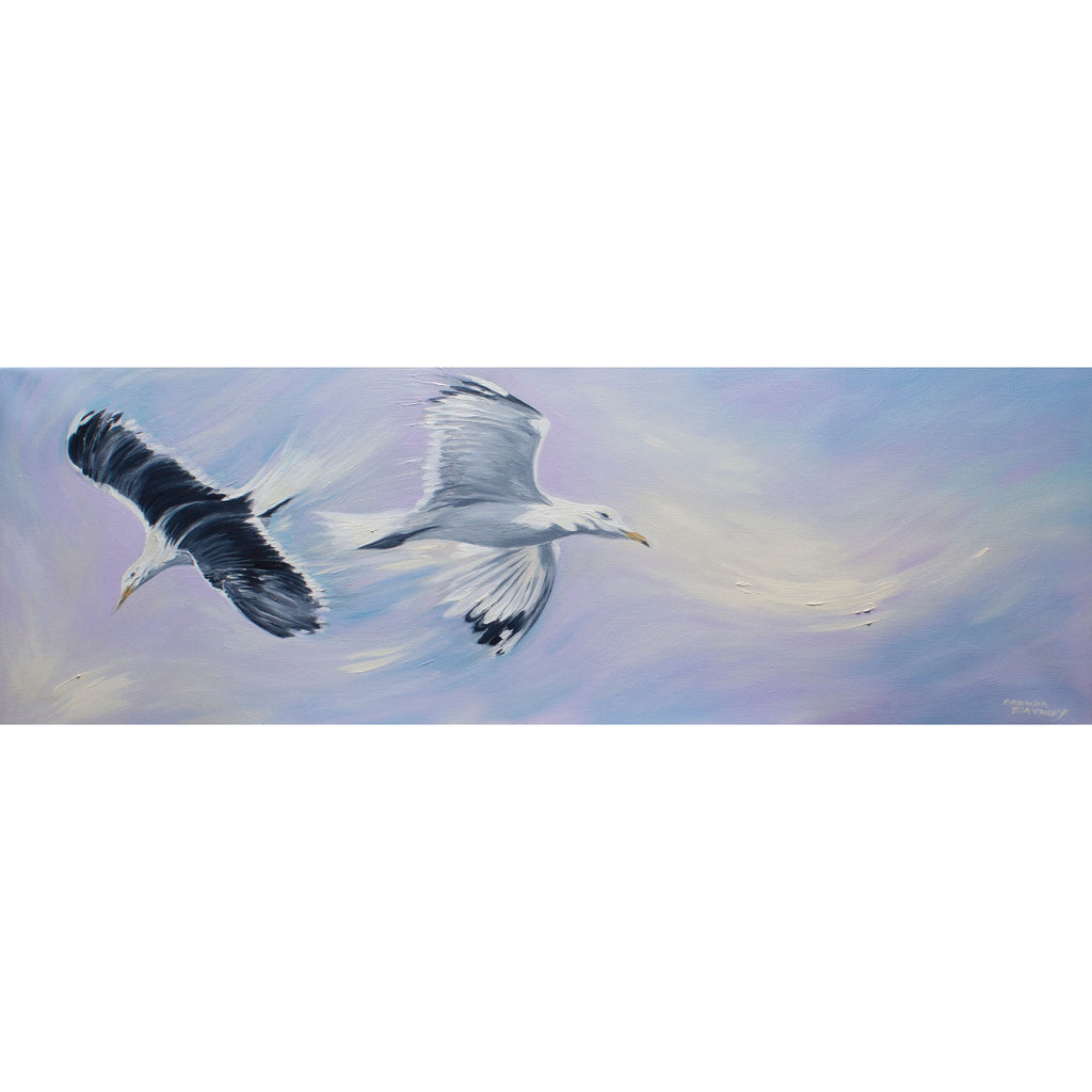 Painted in delicate layers of oil on linen, this work embodies the fleeting grace of Ireland’s coastal life — a moment suspended between sea and sky. The gentle interplay of lilac, blue, and cream tones evokes calm, freedom, and connection to nature’s rhythm.